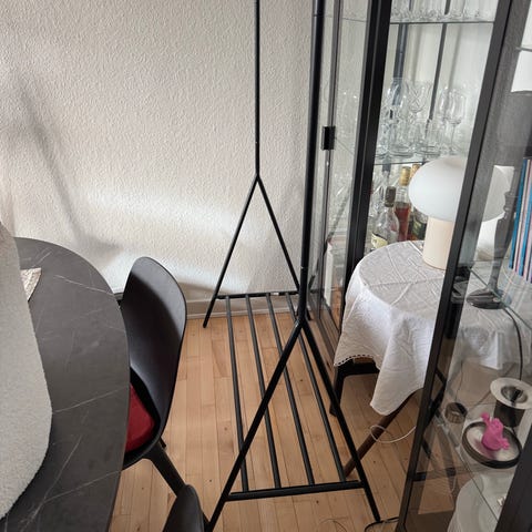 Sælger mit tøjstativ da jeg ikke får brug for det.. det er et let stativ så der kan ikke hænge tunge ting på da der vipper i stængerne hvis der hænger F.eks. mange tunge jakker på.