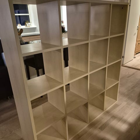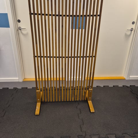Rumdelere i træ med lameller på fronten. Står på små ben og har en glat træoverflade i lys træfarve. Egnet til fx soveværelse, stue eller kontor.