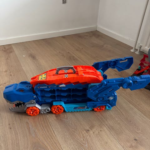 Hot Wheels City Ultimativ transportlastbil kan sluge over 20 biler i størrelsesforhold 1:64 og herefter forvandle sig til en brølende, stampende T-Rex med racerbane på ryggen. I transporttilstand kan børn trække i håndtaget og se den æde de biler i størrelsesforhold 1:64, der kommer i vejen for den. Når de trykker halen tilbage, forvandles den til en robot-T-Rex med lys og lyde og en tosporet racerbane. Børn kan også fyre biler afsted fra dens gab.