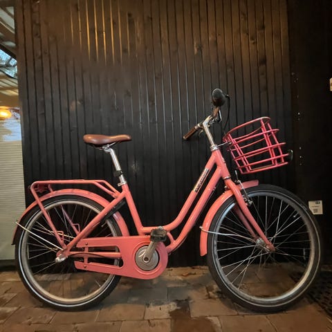 Cyklen har lav indstigning, fastmonteret bagagebærer og fuld kædeskærm. Foran er der cykelkurv i matchende farve med pynteblomster. Velegnet som hverdagscykel til barn i skolealderen.