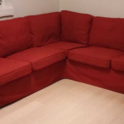 Ektorp hjørnesofa i grøn velour. Betrækket er specialsyet til sofaen, og er derfor unikt og ikke et original Ikea betræk. Der medfølger en puf, samt et betræk til sofaen i samme farve som puffen. Alt betræk kan afmonteres og vaskes i vaskemaskine.