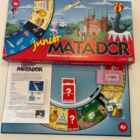 Matador Junior brætspil. Udgave af det klassiske Matador-spil til børn, hvor spillerne bevæger sig rundt på spillepladen, køber felter og samler penge. Spillet egner sig til familiebrug og kan spilles af flere deltagere ad gangen. Indeholder spilleplade, kort, brikker og øvrige spildele efter standard Matador Junior-reglerne.