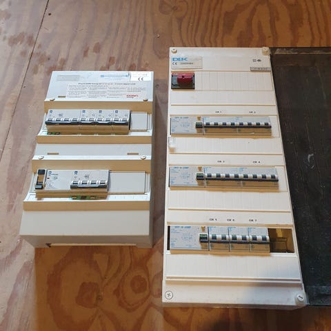 12 modul LK eltavle. Tom. Med jordklemme. Kabler er kommet bagfra så dæksel er ikke skåret ud.