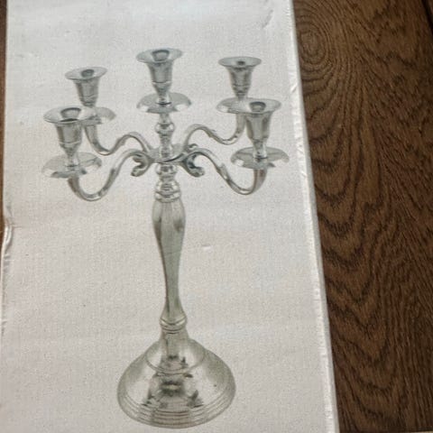 Lysestage i sølvfarvet metal med 5 arme. Klassisk design med rund fod og buede arme, der giver plads til fem stearinlys. Velegnet som borddekoration eller til brug på kommode, skænk eller lignende overflader i hjemmet.