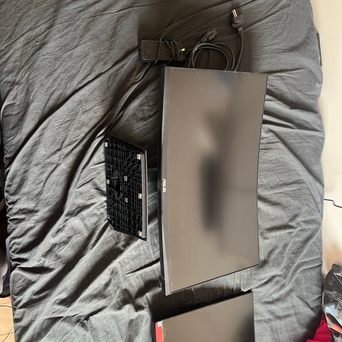 AOC computerskærm på 24 tommer i sort. Skærmen har buet display og står på en trebenet fod. Der medfølger tilslutningskabel, som ses på billedet. Velegnet til brug med stationær computer via de tilgængelige porte på bagsiden, herunder blandt andet HDMI ifølge mærkaten på skærmen.