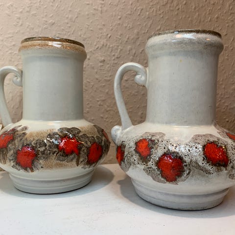 FLOT retro vase DDR keramik fra Strehla Keramik. Fin kuglevase med hank og fine detaljer ved halsen. FLOT mat glasur i fine brune, beige, rust og creme nuancer med TOP lavadecor på kroppen af vasen. FIN DDR nostalgie,,,,!! Vasen er uden skader eller skår.
