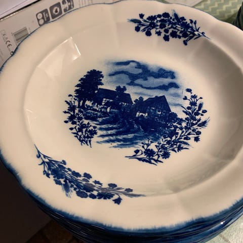 5. tallerken har en misfarvning og sælges derfor med for 10 kroner.
