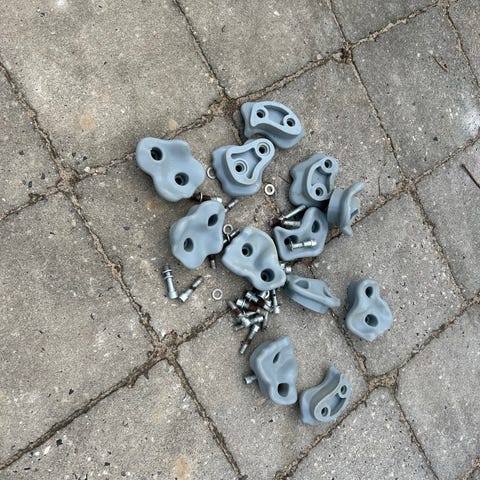 Indendørs klatrevæg med monterede røde klatregreb. Væggen består af lyse plader med forborede huller til fleksibel placering af greb. Egnet til klatring og motoriktræning i hjemmet eller lignende indendørs miljøer. Kan tilpasses i sværhedsgrad ved at flytte eller supplere klatregrebene.