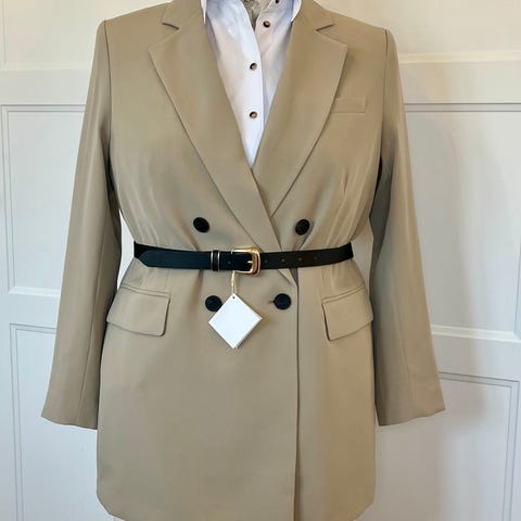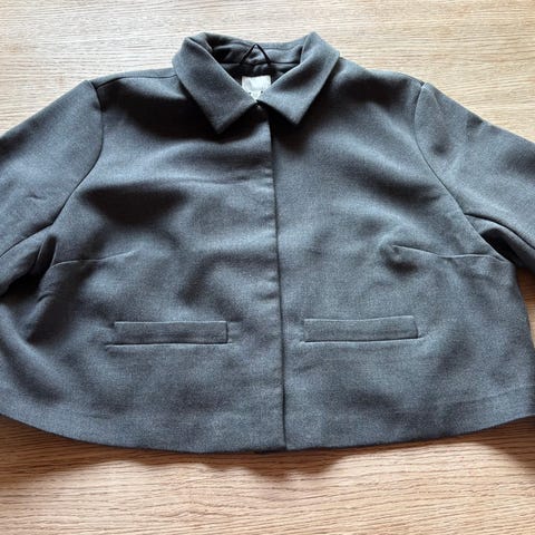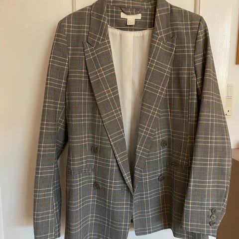 H&M blazer jakke til kvinder i str. XL. Jakken er blå og fremstillet i 75 % polyester, 22% viscose og 3% elastin. Klassisk model med revers, for og klaplommer foran. Ærmerne er let rynkede/opsmøgede, som giver et afslappet udtryk. Velegnet som let jakke eller som del af et mere formelt outfit.