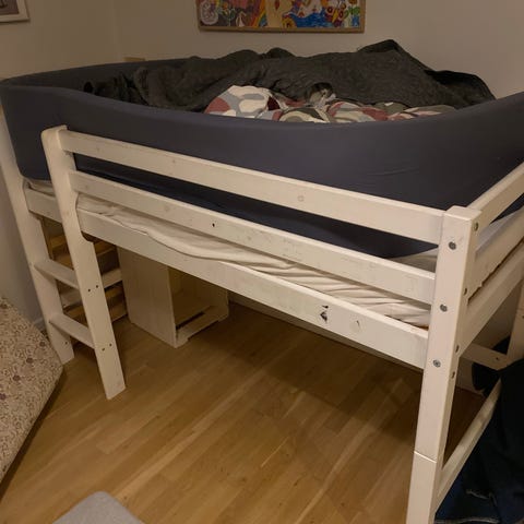 Fin højseng med plads til legetøj under.