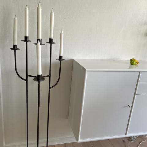 Lysestage til 5 lys i metal i cremefarvet nuance. Lysestagen har fem arme og er beregnet til almindelige stagelys. Den står på en rund fod og egner sig som borddekoration i stue, spisestue eller på et sidebord. Kan bruges enkeltvis eller sammen med andre lysestager for mere belysning.