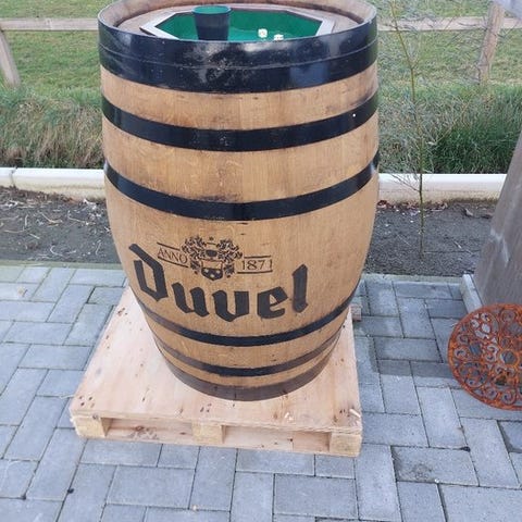 Heaven Hill Bourbon Whiskey egetræsfad med metalbånd. Fadet er et tidligere bourbonfad fra Heaven Hill Distilleries, markeret på toppen med original tryk. Det er udført i massivt egetræ med flere metalbånd omkring til stabilisering. Velegnet som dekoration, møbelprojekt eller til anden kreativ indretning. Fadet har en åbning i siden, som kan bruges til aftapning eller montering af hane, afhængigt af anvendelse. 200 liter. Højde ca. 89 cm. Mål i top og bund 55 cm lidt rykker på midten.