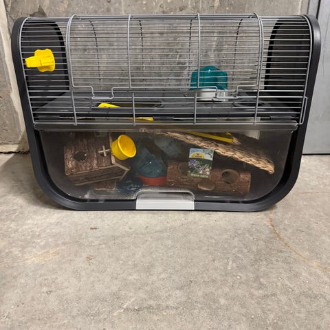 Plastik bur til hamster med gennemsigtigt låg og metalgitter i toppen. Buret har bærehåndtag/rem og ventilationsåbninger i låget. Medfølgende plasttilbehør omfatter løbehjul, rør og kuppel, som kan bruges til indretning og aktivering af små kæledyr som f.eks. hamstere eller andre små gnavere. Velegnet som indendørs bur eller transportbur afhængigt af dyrets størrelse og behov.