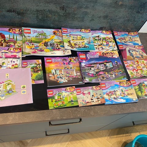 LEGO Friends byggesæt samling. Flere forskellige Friends-sæt med bygninger, figurer og tilbehør, herunder blandt andet en større bygning med detaljeret indretning. Egnet til leg og opbygning af LEGO Friends miljøer med huse, butikker, transportmidler og små scenerier.