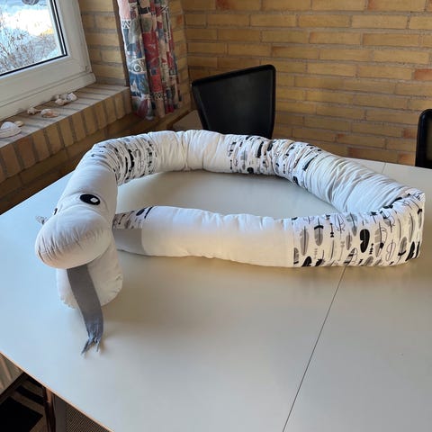 Hjemmelavet sengeslange i mange forskellige farver, der beskytter barnets hoved mod sengegavl, tremmer mv.