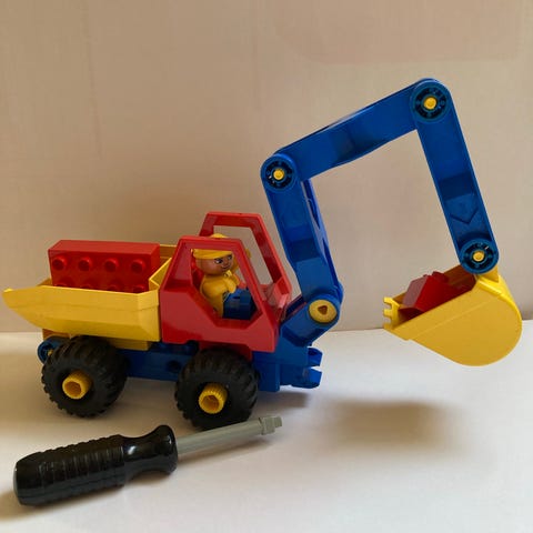 LEGO DUPLO bygge- og gravemaskine med bevægelig gravarm og tiplad.