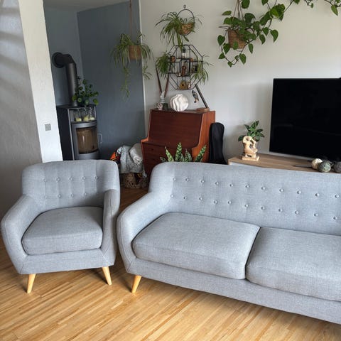 Meget velholdt og pæn sofa. Kender ikke mærket ej heller alder. Lænestolen er af mærket “Farstrup”.