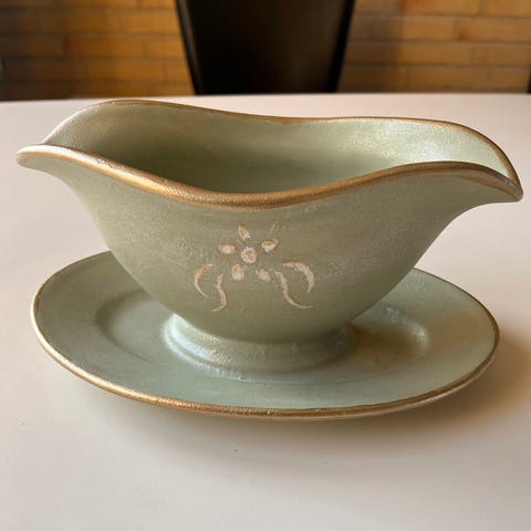 Kanden er lavet af keramik med en glat, hvid overflade og blå mønstre. Den har en praktisk hank.,Bemærk at mail, chat og beskeder ikke besvares, og varen skal købes på knappen "Gå til varen"