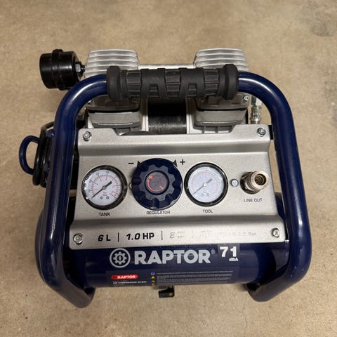 Velholdt Raptor luftkompressor med tilbehør. 24L tank, 1.5HK og 10bar – perfekt til dæk, blæseopgaver, trykluftpistoler og hobbybrug. Medfølger ekstra slange, dækfylder med barometer, blæsepistol. Starter og kører som den skal. Klar til brug.