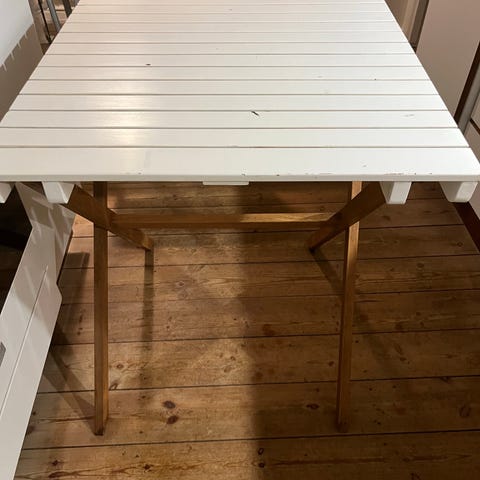 Sammenklappeligt bord med bordplade i træ og stel i metal. Et tungt og robust gammelt bord. Kvadratiske bordplade monteret på et simpelt metalstel med krydsafstivning. Velegnet som arbejdsbord, havebord eller ekstra bordplads i eksempelvis værksted, skur eller udestue. Bordet kan klappes sammen for nem opbevaring, når det ikke er i brug.