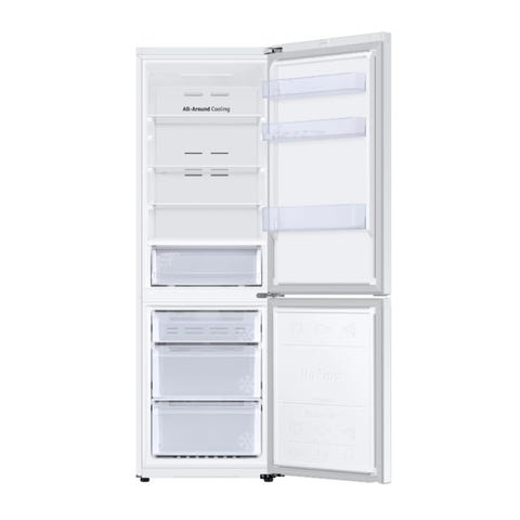 Samsung køle-fryseskab i hvid. Skabet har køledel øverst med flere glashylder, grøntsagsskuffe og dørhylder til opbevaring af fx flasker og mindre varer. Frysedelen nederst er indrettet med udtræksbokse mærket “Full Open Box”, som giver nem adgang til indholdet. Indvendigt er der LED-belysning og justerbare hylder, så pladsen kan tilpasses forskellige typer madvarer. Velegnet som fritstående køle-fryseskab i køkken eller bryggers.