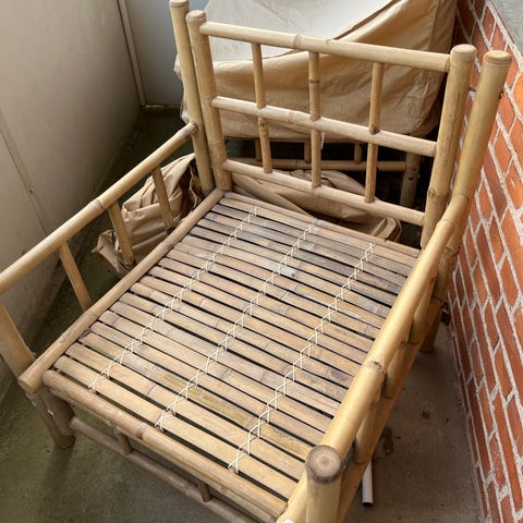 Rund bambusstol og matchende sidebord i naturfarve. Stolen har buet ryg og sæde opbygget af bambus, der giver et hyggeligt udtryk. Sidebordet har rektangulær bordplade med glasplade øverst og en ekstra hylde nederst til opbevaring. Sættet egner sig til brug i stue, udestue, altan eller terrasse, hvor der ønskes lette møbler i naturmateriale.