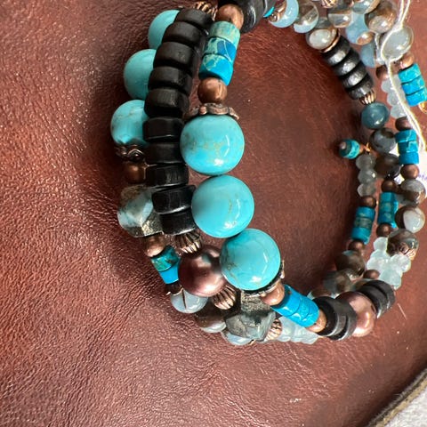 Her et skønt armbånd, hvor der er et hav af perler, fx. Sodalit, hæmatit, lava, Agat mf. Perlerne er fra 3-8mm