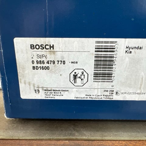 Hyundai bremsesæt bestående af Bosch bremseskiver og bremseklodser. Sættet indeholder fire bremseskiver samt et sæt på fire bremseklodser. Delene er beregnet til en Hyundai i10 årgang 2013-2021. Se eventuelle delenumre på æskerne for at kontrollere kompatibilitet med specifik Hyundai-model og årgang. Velegnet som udskiftning af slidte bremsedele på bilen.