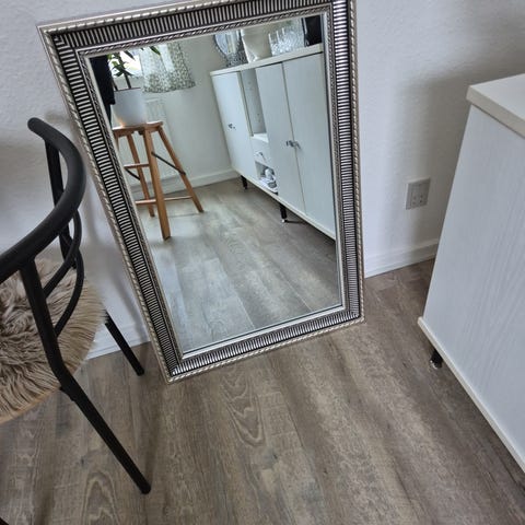 IKEA spejl med rektangulær form og guldfarvet ramme. Rammen har profileret kant og dekorative detaljer langs inderkanten. Velegnet som stående eller lænende spejl i fx stue, soveværelse eller entré, hvor der er behov for et helkropsspejl eller et større vægspejl.