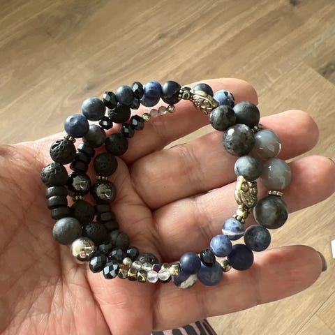 Har dette fantastiske armbånd, med Pyrit, jade, Kokos, Hawlit mf. Det er på wire og i tre rækker. Nedsat!