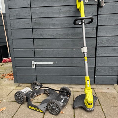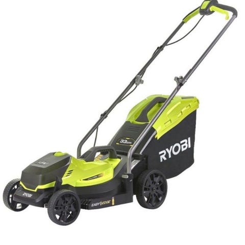 Ryobi 175 cc benzindrevet plæneklipper. Plæneklipperen har fire hjul og håndskub, og motoren er benzindrevet. Velegnet til klipning af almindelige græsplæner. Maskinen har højdejusterbart håndtag og opsamler foran motoren. Farven er primært gul med sorte detaljer.