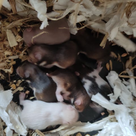 Jeg sender et aktuelt billede. Hamstrene er stadig meget små, men jeg har kun omkring fem uger til at finde hjem til dem, derfor skriver jeg allerede nu – så der forhåbentlig er tid til det, og så vi ikke ender med en hel flok hamstre. 🐹