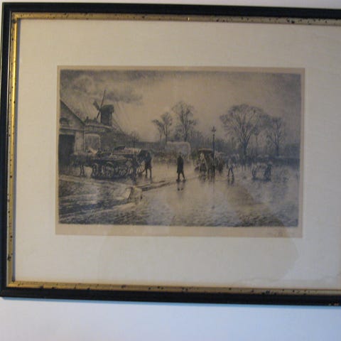 Meget fin radering indrammet i bred lakeret træramme. Mål med ramme: 45 x 53 cm. Selve motivet er 25 x 32 cm. Indrammet med passepartout. Giver fint indblik i en lille gade med børn og deres påklædning for lidt over 100 år siden. Signeret i trykket med Peter Tom Petersens signatur og årstal 1915.