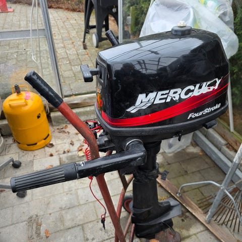 Mercury 4.0 FourStroke påhængsmotor i sort. Benzindrevet bådmotor med udvendig brændstoftank og håndtag til styring og gas. Egnet som påhængsmotor til mindre både, joller eller som hjælpermotor. Firetaktsmotoren er konstrueret til montering på hækken af båden og betjenes manuelt fra cockpittet eller agterspejlet.