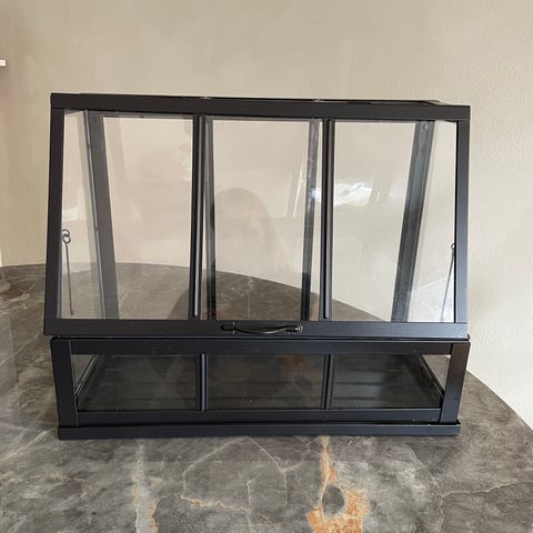 Minidrivhus i glas som står på 2 pallerammer.