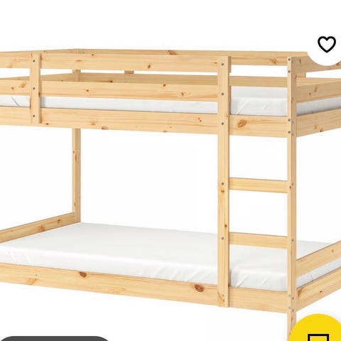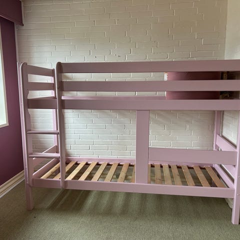 Køjeseng i hvidbejset træ. Har enkelte skrammer, men i fin stand.