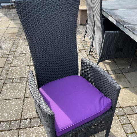 Sæt med rektangulært havebord og tilhørende stole i polyrattan. Bordet har lamelbordplade i grå nuance og metalstel. Stolene er i mørk polyrattan med lyse sædehynder. På billederne ses en mindre skade i bordpladen. Der medfølger også en solseng i matchende polyrattan med polstret madras i lys farve. Sættet er egnet til udendørs brug på terrasse eller i have.