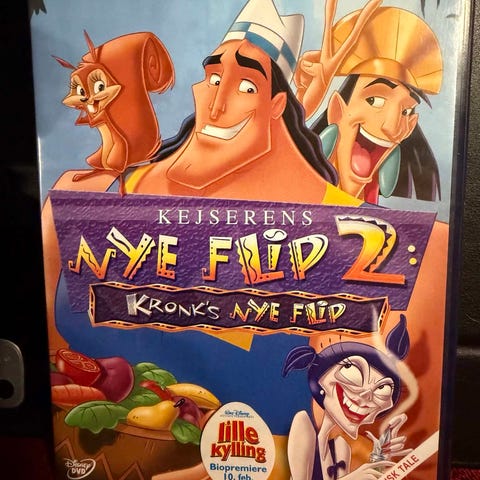 Disney Kejserens nye flip og Kejserens nye flip 2 dvd tegnefilm med dansk tale. Animerede familiefilm med figurerne Kuzco, Pacha, Yzma og Kronk. Egnet til børn og familier, kan afspilles på dvd-afspillere der understøtter standard dvd-format.