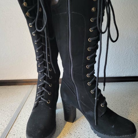Støvlerne er sorte med snørelukning foran og lynlås i siden. De har blokhæl og kraftig sål med synlige stikninger langs kanten. Lettere brugt.