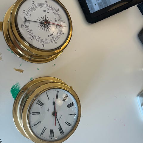 barometer - hygrometer - ur - termometerGeorg Jensen vægure og vejrstation bestående af fire runde enheder i metal med sort skive. Sættet omfatter ur, barometer og to øvrige måleinstrumenter til indendørs brug. Alle dele har ensartet, rund form med blank metalramme og central viser på mørk baggrund med lys skrift. Velegnet som samlet vægmontering i hjem eller kontor, hvor der ønskes både tids- og vejrrelaterede målinger i et ensartet design.