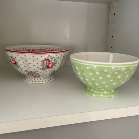 En jumbo kop, en kop med hank, to dessert tallerkener.