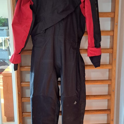 Dry Fashion tørdragt i str 146 rød og blå med integrerede sorte støvler. Dragten har vandtæt lynlås hen over overkroppen og latexmanchetter ved hals og håndled. Egnet til vandaktiviteter som kajak, kano eller anden vandsport, hvor der er behov for at holde kroppen tør. Materialet fremstår som kraftigt tekstil med forstærkede gummidele ved støvler og manchetter.