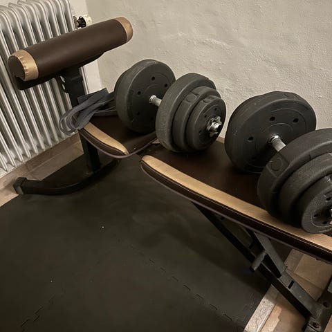 Sættet består af en justerbar træningsbænk med polstrede ligge- og siddeflader samt flere håndvægte med vægtskiver. Bænken kan anvendes til forskellige styrketræningsøvelser som bænkpres, skulderpres og maveøvelser. Håndvægtene har udskiftelige vægtskiver, så vægten kan tilpasses efter behov. Velegnet til hjemmetræning og generel styrketræning.
