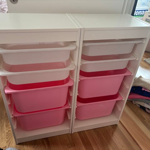 IKEA opbevaringskasser i hvid plast 37L. Kasserne kan stables oven på hinanden og har klaplåg på forsiden, så indholdet kan nås, selv når de står i en stabel. Velegnet til opbevaring af legetøj, tøj, tilbehør eller andre småting på børneværelse, bryggers eller garderobe. Plastmaterialet er let at rengøre med en fugtig klud.