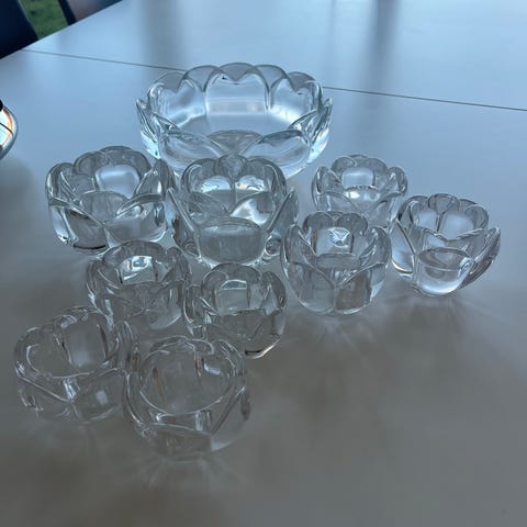 Holmegaard lysestager og skål i klart glas. Sættet består af to fyrfadsstager og en rund skål, alle med organisk, blomsterlignende form i kanten. Lysestagerne er velegnede til fyrfadslys, og skålen kan bruges til dekoration, servering af mindre snacks eller som lysfad. Designet er enkelt og tidløst, og delene passer til borddækning, vindueskarm eller som del af en glasdekoration.