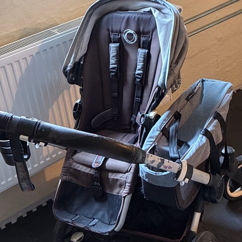 Bugaboo ståbræt med sæde til Donkey Dou. Ståbrættet fungerer fint og vores storesøster har stået på det for nylig, men det er brugt som det kan ses på billede to.