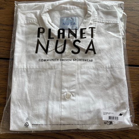 Planet Nusa skjorte til kvinder i størrelse L. Skjorten er hvid og fremstillet i bomuld. Klassisk model med knaplukning foran. Velegnet til hverdagsbrug eller som del af et afslappet sportsinspireret outfit.