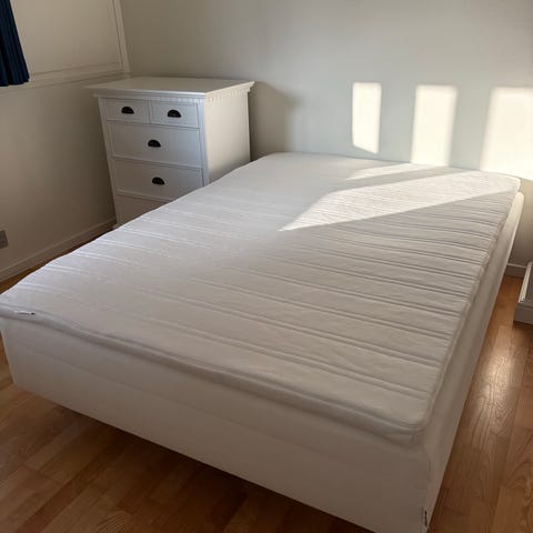 IKEA seng med madras i grå farve. Sengen består af en madras på en enkel ramme med ben. Egnet som enkeltseng eller mindre dobbeltseng. Passer til soveværelse, gæsteværelse eller som ekstra seng. Materiale er standard tekstilbetræk på madrassen og en enkel træramme under, som giver støtte til madrassen.