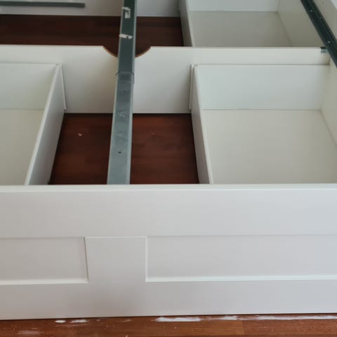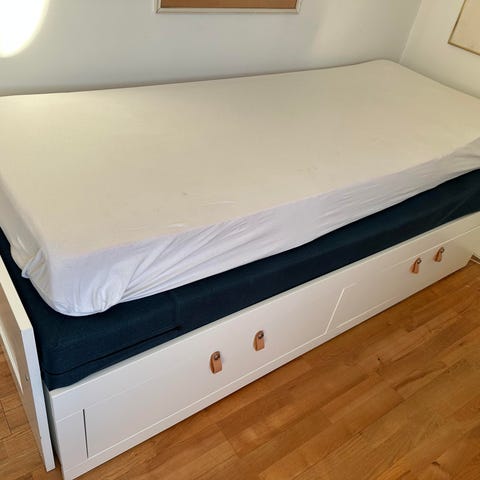 Fin seng med 2 skuffer til opbevaring, kan trækkes ud til 2x 80 i bredden.