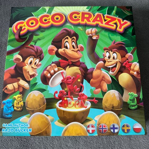 Spillet indeholder spilleplade, plastik-kokosnødder, farvede spillebrikker samt terning. Temaet er aber og kokosnødder, hvor spillerne flytter rundt på brættet og forsøger at finde de rigtige brikker gemt i kokosnødderne.